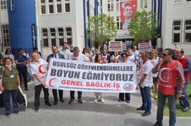 Ege Üniversitesi Hastanesi’nde sendika temsilcisi olan ve kanser tedavisi gören Sevda Anşen’in, kendisi için risk oluşturacak bir bölümde görevlendirilmesine tepki gösterildi. Genel Sağlık ve Sosyal Hizmet İşkolu Kamu Çalışanları Sendikası İzmir Şubesi, Ege Üniversitesi Hastanesi temsilcilerinin görev yerinin usulsüz olarak değiştirilmesine ilişkin başhekimlik önünde basın açıklaması yaptı. “Usulsüz görevlendirmelere boyun [Devamını Oku…]