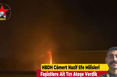 HBDH Cömert Nazif Efe Milisleri 19 Nisan gecesi Bursa Osmangazi Köprüsü istikametinde otoparkların olduğu bölgede faşistlere ait tırı özel bir teknik ile ateşe verdiklerini açıkladı. AKP-MHP faşizmi Başur Kürdistan’a yönelik işgal operasyonu başlattı. İşgal güçleri karşısında özgürlük gerillaları destansı bir direniş sergiliyor. Faşizm kaybetme korkusuyla her geçen gün daha da [Devamını Oku…]