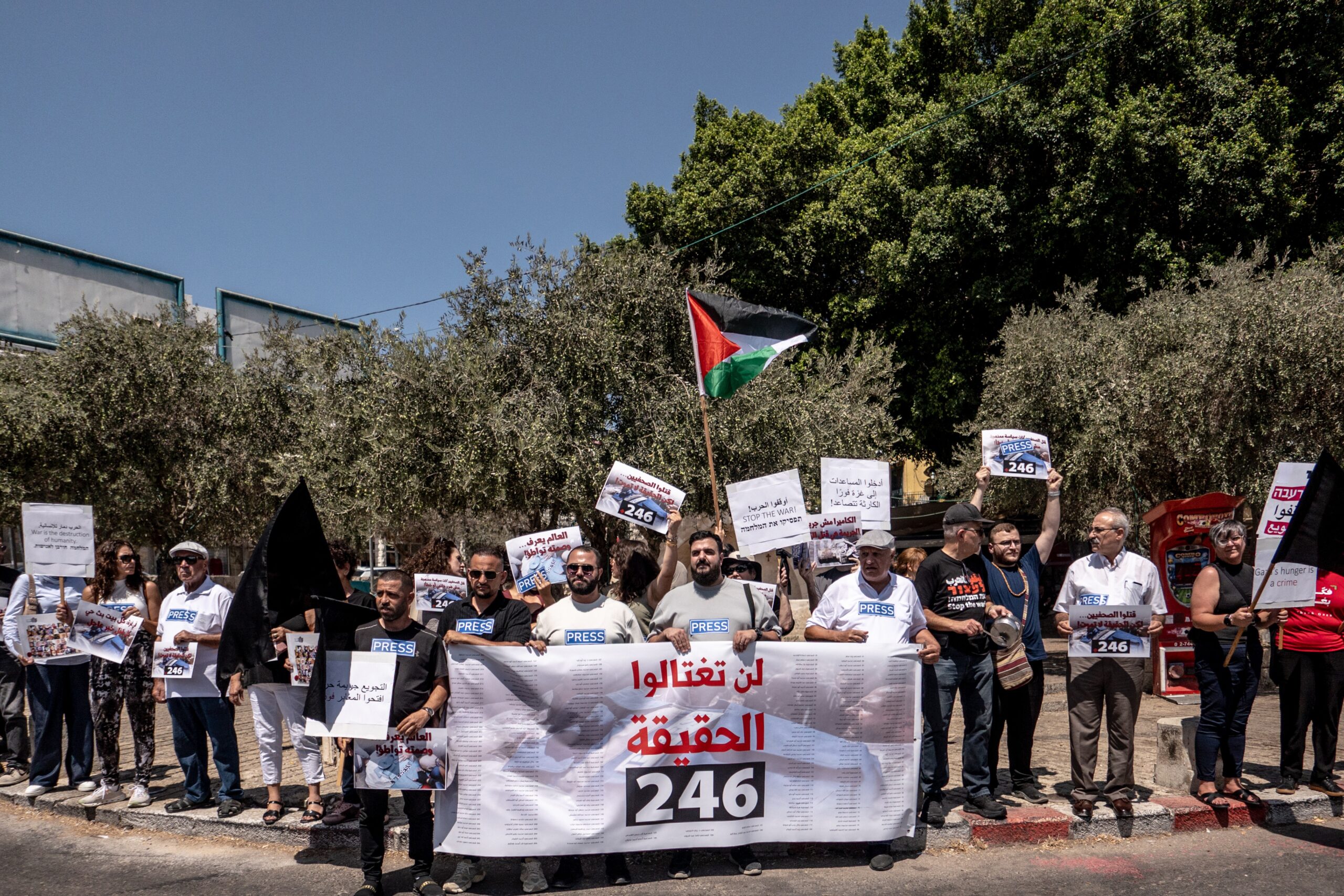 İsrail’in kuzeyinde yer alan Nasıra kentinde toplanan gazeteciler, Gazze’deki açlığın sona ermesini talep ederek İsrail güçlerinin gazetecileri hedef almasını protesto etti. Göstericiler, “Gazze’de çocuklar ölüyor, gazeteciler hedef alınıyor” yazılı pankartlar ile hayatını kaybedenlerin fotoğraflarını taşıdı. Kaynak: Evrensel
