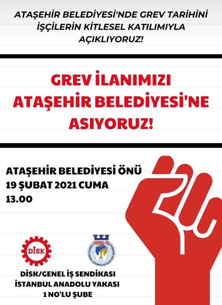 DİSK Genel-İş yaptığı açıklamada “Sendikamız ile Ataşehir Belediyesi Personel Limited Şirketi arasında, 2200 işçiyi kapsayan toplu iş sözleşmesinde anlaşma sağlanamadığından, 19 Şubat 2021 Cuma günü, saat 13:30’da yasal hakkımız olan GREV KARARI’nı, yapacağımız basın açıklaması ile Ataşehir Belediyesi kapısına asacağız.” dedi. Açıklamada emekten yana olan tüm kişi ve kurumları basın [Devamını Oku…]