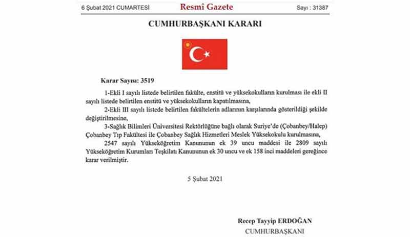 AKP’li Cumhurbaşkanı Tayyip Erdoğan, 5 Şubat 2021 tarihli kararname ile Suriye’nin Halep kentinin Al Rai ilçesinde tıp fakültesi açma kararı aldı. Resmi Gazete’de yayımlanan Cumhurbaşkanı Kararı’nda,”Sağlık Bilimleri Üniversitesi Rektörlüğü’ne bağlı olarak Suriye’de (Çobanbey/Halep) Çobanbey Tıp Fakültesi ile Çobanbey Sağlık Hizmetleri Meslek Yüksekokulu kurulması” açılacağı duyuruldu.