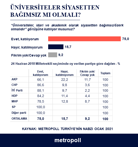 Metropoll’ün son zamanlarda eylemlerle karşı çıkılan Boğaziçi’ne rektör atanmasını halka sordu. Araştırmasına göre AKP seçmeni arasında bile rektörün Saray tarafından atanmasını savunanlar azınlıkta. ‘Türkiye’nin Nabzı Ocak 2021: Üniversite rektörleri nasıl seçilmelidir?’ başlıklı araştırmaya göre, ‘öğretim elemanları rektörleri kendileri seçmelidir’ diyenlerin oranı yüzde 73 iken, ‘rektörleri cumhurbaşkanı tayin etmelidir’ diyenlerin oranı yüzde 17.9. Yüzde 9.1 ise [Devamını Oku…]