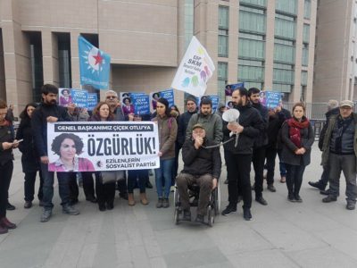 22 Ağustos’tan bu yana tutuklu bulanan Ezilenlerin Sosyalist Partisi (ESP) Genel Başkanı Çiçek Otlu’nun davası İstanbul Adliyesi 25. Ağır Ceza Mahkemesi’nde görülecek. Duruşma öncesi ESP üyeleri adliye önünde basın açıklaması yaptı. Otlu’nun fotoğrafının yer aldığı “Genel Başkanımız Çiçek Otlu’ya özgürlük” yazılı pankartın açıldığı eyleme Halkların Demokratik Partisi (HDP) Bitlis Milletvekili [Devamını Oku…]