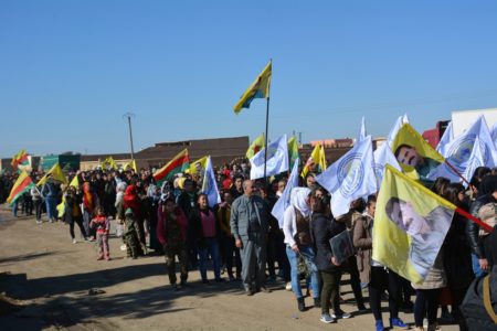 TEV-DEM tarafından organize edilen yürüyüşe Cizre Bölgesi’nden on binlerce kişi katılıyor. Yürüyüş, Qamişlo’nun batısında bulunan Himo köyünden kent merkezinde bulunan Şehit Xebat Meydanı’na dek sürecek. QSD, YPG ve YPJ bayrakları taşıyan yürüyüşçüler, Çağın Direnişi olarak isimlendirilen Efrin Direnişi’ni selamlayan sloganlar atıyor. Kaynak: ANHA
