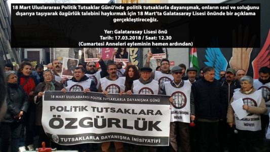 Tutsaklarla Dayanışma İnisiyatifi olarak 18 Mart Uluslararası Politik Tutsaklar Günü’ne ilişkin basın açıklaması çağrısı yaptı. Açıklama, İstanbul’da, 17 Mart tarihinde Cumartesi Anneleri eyleminin ardından, Galatasaray Lisesi’nin önünde gerçekleştirilecek. TDİ’nin çağrı metni şöyle: Basına ve kamuoyuna Tutsaklarla Dayanışma İnisiyatifi olarak 18 Mart Uluslararası Politik Tutsaklar Günü’nde Türkiye ve Kürdistan başta olmak [Devamını Oku…]
