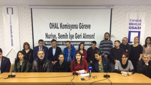 Açlık grevinde 285 günü geride bırakan akademisyen Nuriye Gülmen ve öğretmen Semih Özakça’nın OHAL Komisyonu tarafından dosyalarının görüşülüp işlerine iade edilmeleri için Mimarlar Odası Ankara Şubesi’nde basın açıklaması düzenlendi. Nuriye ve Semih için Dayanışma Ankara Platformu’nun organize ettiği açıklamaya CHP Milletvekilleri Şenal Sarıhan, Onursal Adıgüzel, Orhan Sarıbal ve Ali Şeker’in [Devamını Oku…]
