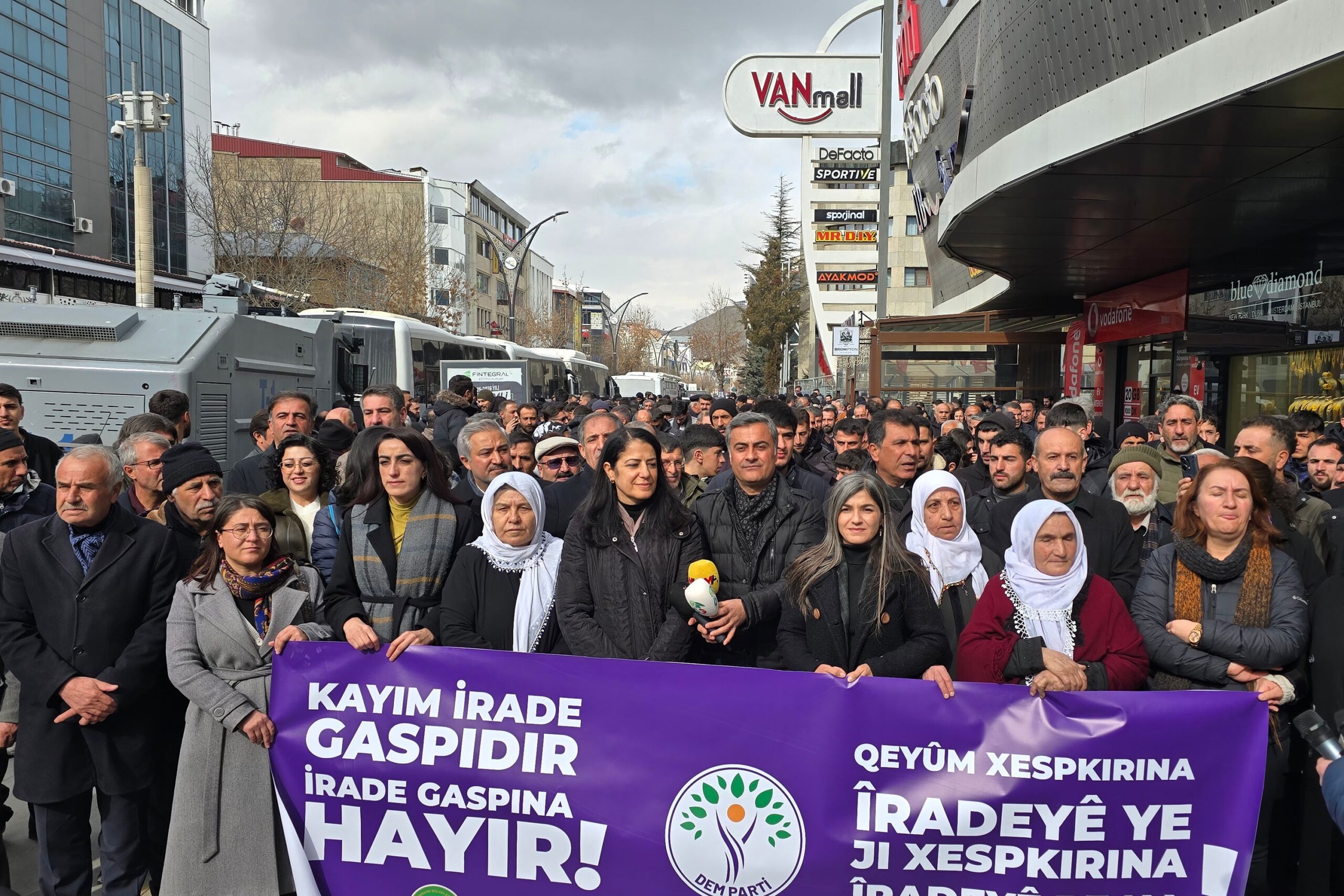 Van’da kayyım atanması bir kez daha protesto edildi. Eylemde konuşan Ayla Akat Ata, “Bu barikatlar çözüm değil. Belediyelere kayyım atamak akıl kârı değil, çözüm değil” dedi. Van Büyükşehir Belediyesine kayyım atanmasına halkın tepkisi sürüyor. Bugün VanMall önünde Özgür Kadın Hareketi (Tevgera Jinên Azad – TJA), Demokratik Bölgeler Partisi (DBP) ve [Devamını Oku…]