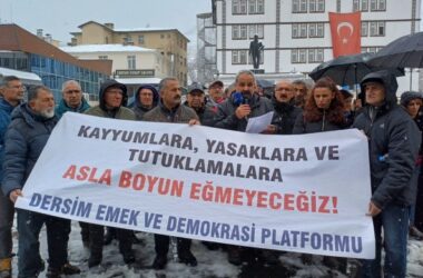Dersim Emek ve Demokrasi Platformu, kayyım, tutuklama ve yasaklamalı protesto etti. Dersim Emek ve Demokrasi Platformu, belediyelere kayyım atanması, tutuklama ve yasaklamaları protesto etti. Açıklamada “Kayyımlara, yasaklamalara ve tutuklamalara asla boyun eğmeyeceğiz” yazılı pankart açıldı. Protesto eyleminde konuşan Ergin Tekin, “Bu saldırılar, yalnızca bireylere yöneltilmiş hukuksuz bir cezalandırma değil, aynı [Devamını Oku…]