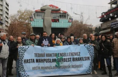 Hasta tutsakların durumuna dikkat çekmek için İstanbul ve Ankara’da yapılan eylemlerde tedavi haklarının sağlanması için tahliye edilmeleri talep edildi. İnsan Hakları Derneği (İHD) İstanbul Şubesi Hapishane Komisyonu, her hafta düzenledikleri “F Oturması ” eyleminin 673’üncüsünü Beyoğlu’nda bulunan şube binası önünde gerçekleştirdi. Eylemin bu haftasında Kırşehir S Tipi Hapishanesi’nde tutulan 30 [Devamını Oku…]