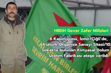 Halkların Birleşik Devrim Hareketi (HBDH) Gever Zafer Milisleri tarafından yapılan yazılı açıklamayla, İzmir’de kayyumlara karşı eylem yaptığını açıkladı. Milisler tarafından yapılan açıklamada, şu ifadelere yer verildi: “HBDH Gever Zafer (Ali Bor) Milisleri, 6 Kasım günü, İzmir/Çiğli’de, Atatürk Organize Sanayi Sitesi/1026 sokakta bulunan Kimyasal Dolum ve Üretim Fabrikası ateşe verdi. Eylemde fabrika [Devamını Oku…]