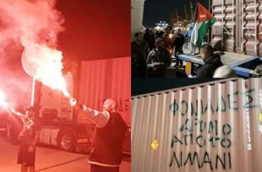 Yunanistan’ın Pire limanında çalışan işçiler, Siyonist İsrail’e gittiğini öğrendikleri mühimmat dolu konteynerin yüklenmesine izin vermedi. Eylem yapan işçiler konteynerin üzerine Filistin bayrağı astı. Yunanistan’ın Pire kentinde bulunan Cosco limanında çalışan işçiler, İsrail’e gittiğini öğrendikleri mühimmat dolu konteyneri durdurmak için gece eylem yaptı. Konteynerin yüklenmesine izin vermeyen işçiler üzerine Filistin bayrağı [Devamını Oku…]