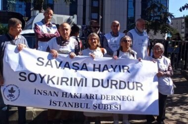 İHD, İsrail Konsolosluğu önünde yaptığı açıklamada Birleşmiş Milletler’e “soykırımı durdur” çağrısı yaptı. İnsan Hakları Derneği İstanbul Şubesi, İsrail’in Filistin’e yönelik bir senedir süren saldırılarına karşı Levent’te bulunan İsrail Konsolosluğu önünde açıklama yaptı. “Savaşa hayır, soykırımı durdur” pankartının açıldığı açıklamada, konuşan İHD İstanbul Şube Sekreteri Oya Ersoy, İsrail’in Filistin’e yönelik saldırısında [Devamını Oku…]