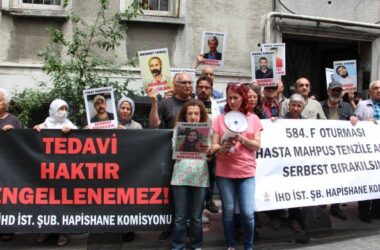 Bu hafta düzenlenen “F Oturumu” eyleminde hasta tutsak Tenzire Acar’ın yaşamının tehlike altında olduğu uyarısında bulunuldu. İnsan Hakları Derneği (İHD) İstanbul Şubesi Hapishaneler Komisyonu, hasta tutukluların durumuna dikkat çekmek amacıyla her hafta düzenledikleri “F Oturumu” eyleminin 584’üncüsünü dernek binası önünde gerçekleştirdi. Bu haftaki eylemde, Bakırköy Kadın Kapalı hapishanesi’nde tutuklu bulunan [Devamını Oku…]