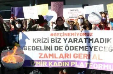 İzmir Kadın Platformu, yüksek gelen faturaları tencerelerde yakarak zamları protesto etti İzmir Kadın Platformu, yapılan fahiş zamları “Geçinemiyoruz” diyerek protesto etti. Karşıyaka İzban durağı önünde bir araya gelen kadınlar, “Krizi biz yaratmadık, bedelini de biz ödemeyeceğiz. Zamları geri al” pankartı açarken, “Kriz varsa isyan var”, “Külfet bizim sefa sizin olmayacak”, [Devamını Oku…]