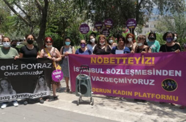 İskenderun Kadın Platformu, İstanbul Sözleşmesi’ne ilişkin düzenlediği eylemde “Vazgeçmiyoruz” dedi. İskenderun Kadın Platformu, İstanbul Sözleşmesi’ne sahip çıkmak için Eski Bit Pazarı’nda bir araya geldi. “Nöbetteyiz! İstanbul Sözleşmesi’nden vazgeçmiyoruz” ve “Deniz Poyraz onurumuzdur. Baş eğmeyeceğiz” pankartını taşıyan kadınlar, Deniz Poyraz’ın katledilmesini de kınadı. İskenderun Kadın Platformu üyesi Feyruz Gör, İstanbul’da düzenlenen [Devamını Oku…]