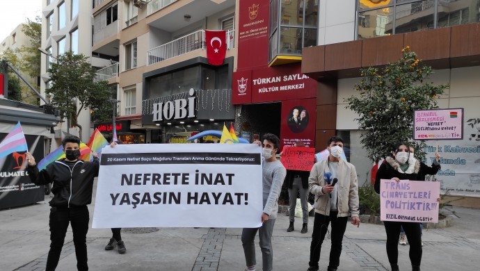 İzmir’de Kızıl Okyanus, Üniversiteli Kadın Kollektifleri ve Özgür Genç Kadın, 20 Kasım Nefret Suçu Mağduru Transları Anma Günü’ne ilişkin basın açıklaması yaptı. Türkan Saylan Kültür Platformu önünde yapılan açıklamada, “Nefrete inat yaşasın hayat” pankartı açıldı. Açıklamayı imzacılar adına İsmail Temel okudu. Türkiye trans cinayetleri sıralamasında Avrupa’da 1’inci sırada olduğunu dile getiren Temel, [Devamını Oku…]