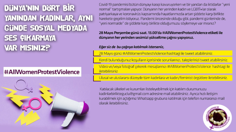 Dünyanın dört bir yanından kadınlar, 28 Mayıs’ta, sosyal medyada şiddete, şiddeti önlemek yerine kadınları hedef gösterenlere, pandemiyi kadın, LGBTİ+ ve çocukların haklarına müdahale için fırsata çevirenlere karşı ses çıkaracak. Sosyal medya eylemi saat 13.00’da #AllWomenProtestViolence etiketi ile gerçekleştirilecek. Kadınlar Birlikte Güçlü’nün de içinde yer alacağı eylem için yapılan çağrıda şunlar [Devamını Oku…]