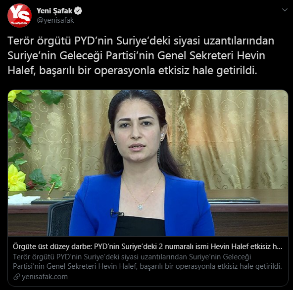 Yeni Şafak gazetesi, IŞİD saldırısında hayatını kaybeden Suriye Gelecek Partisi Eş Başkanı Hewrin Xelef’in ölüm haberini “Terör örgütü PYD’nin Suriye’deki siyasi uzantılarından Suriye’nin Geleceği Partisi’nin Genel Sekreteri Hevin Halef, başarılı bir operasyonla etkisiz hale getirildi. ” diye paylaştı. Türkiye’nin Rojava’ya dönük işgal operasyonu sonrası, sınıra giden sivillerle beraber iken, IŞİD’in [Devamını Oku…]