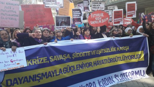 Kadınlar, Ankara Kadın Platformu’nun çağrısıyla 8 Mart Dünya Kadınlar Günü için Sakarya Caddesi’nde bir araya geldi. Ankara Kadın Platformu’nun çağrısıyla Ankaralı kadınlar 8 Mart Dünya Kadınlar Günü için Sakarya Caddesi’nde bir araya geldi. “Krize, savaşa, şiddete ve eşitsizliğe karşı dayanışmayla güçleniyor, hayatı örgütlüyoruz!” sloganıyla, kitlesel ve coşkulu geçen buluşmada açıklama [Devamını Oku…]