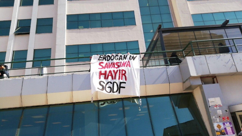 Sosyalist Gençlik Dernekleri Federasyonu (SGDF), Suriye’de süren savaşa karşı İstanbul’da bulunan üniversitelere pankartlar asarak “Erdoğan’ın savaşına hayır” dedi. SGDF üyeleri Mimar Sinan Üniversitesi Güzel Sanatlar Fakültesi (MSGSÜ), İstanbul Üniversitesi (İÜ), Yıldız Teknik Üniversitesi (YTÜ) ve Boğaziçi Üniversitesi’ne pankartlar astı. “Erdoğan’ın savaşına hayır” yazılı pankartlar asan sosyalist gençler üniversitelileri Erdoğan’a ve [Devamını Oku…]