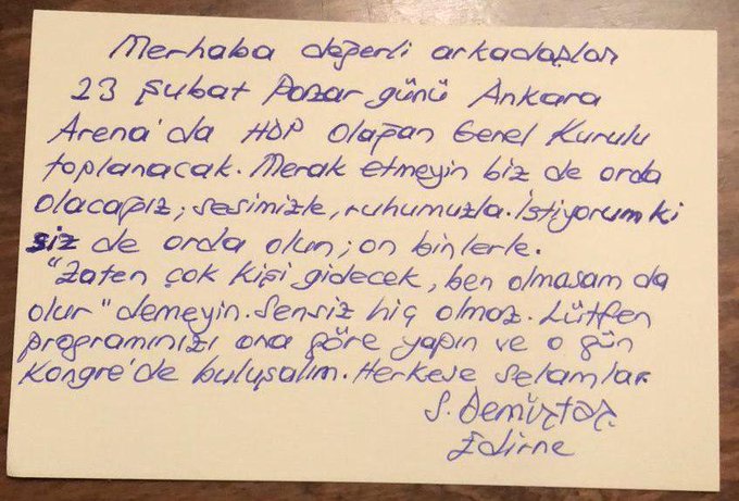 HDP’nin önceki dönem Eş Genel Başkanı olan Selahattin Demirtaş, 23 Şubat’ta toplanacak olan HDP Genel Kongresi için çağrı yaptı. HDP, 23 Şubat’ta olagan Genel Kongresini toplamaya hazırlanıyor. Kongre çalışmaları devam ederken, HDP’nin önceki dönem Eş Genel Başakanı olan ve Edirne’de tutuklu bulunan Selahattin Demirtaş, kongre için bir çağrı mesajı gönderdi. [Devamını Oku…]