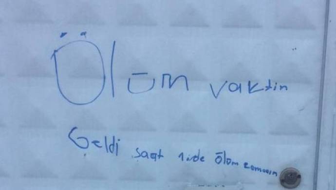 BURSA – Bursa Pir Sultan Abdal Dernek Başkanı Ali Öztürk’ün evinin kapısına kimliği belirsiz kişi veya kişiler tarafından “ölüm vaktin geldi, ecel zamanı geldi” şeklinde yazılama yapıldı. Derneğin genel merkezi, suç duyurusunda bulunacaklarını açıkladı. Pir Sultan Abdal Kültür Derneği Bursa Şube Başkanı Ali Öztürk’ün evinin kapısına kimliği belirsiz kişi veya kişiler tarafından [Devamını Oku…]
