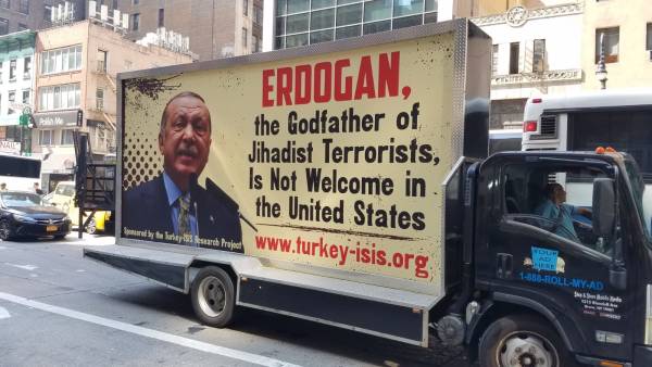 BM İklim Zirvesi sırasında ‘Türkiye-DAİŞ’ afişi New York’taki Birleşmiş Milletler İklim Zirvesi sırasında Türkiye ile DAİŞ çeteleri arasındaki işbirliğine dikkat çeken mobil bir afiş dikkat çekti. Turkey-ISIS Research Project (Türkiye-DAİŞ araştırma projesi) sponsorluğunda New York’ta dolaştırılan mobil afişte, Türk Cumhurbaşkanı Recep Tayyip Erdoğan’ın ABD’ye hoş gelmediği belirtildi. Erdoğan’ın fotoğrafının bulunduğu [Devamını Oku…]