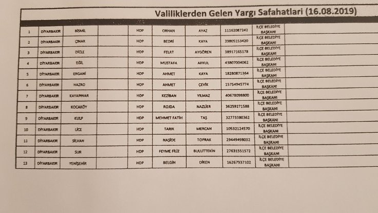 Diyarbakır Barosu avukatlarından Sertaç Buluttekin, İller İdaresi Genel Müdürlüğü’nün ilçe belediye başkanları hakkında bilgi istendiğini ifade etti. Buluttekin, “İlçe belediyelerine de kayyım atama hazırlığı yapılıyor” dedi. Buluttekin’in paylaştığı 16 Ağustos tarihli belgede ise, “Valiliklerden Gelen Yargı Safahatları” başlığı altında Diyarbakır’ın Bismil, Çınar, Dicle, Eğil, Ergani, Hazro, Kayapınar, Kocaköy, Kulp, Silvan, [Devamını Oku…]