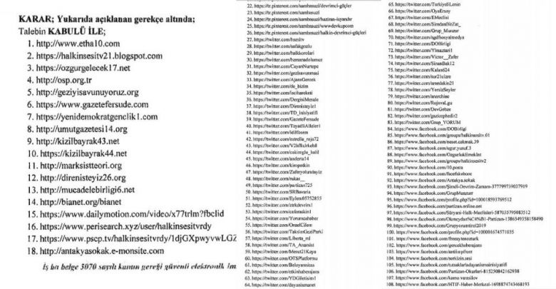 Ankara 3. Sulh Ceza Hâkimliği, Jandarma Genel Komutanlığı’nın 16 Temmuz tarihli yazısı ile aynı gün 136 adresin erişiminin engellenmesine karar verdi. Erişimin engellenmesi kararı verilen URL adresleri arasında Facebook, Instagram, Twitter, Youtube, Pinterest adreslerinin yanı sıra haber portalları da yer alıyor. 15 internet sitesi Ankara 3. Sulh Ceza Hakimliği’nin kararında [Devamını Oku…]