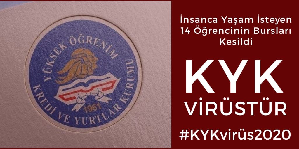 Kredi ve Yurtlar Kurumu (KYK) önünde “İnsanca Yaşamak İstiyoruz!” dedikleri için hukuksuzca bursları kesilen Ankara Üniversitesi 14 öğrenci için Twitter’da “KYKVirüs2020” hashtagi başlattı. Ankara’da LasTesis eylemi sonrası yaşanan saldırılar ve KYK’nın burs kesme tehditlerine ilişkin KYK önünde yapılmak istenen basın açıklamasına polis saldırmış, 30!a yakın öğrenci gözaltına alınmıştı. Ardından 14 [Devamını Oku…]