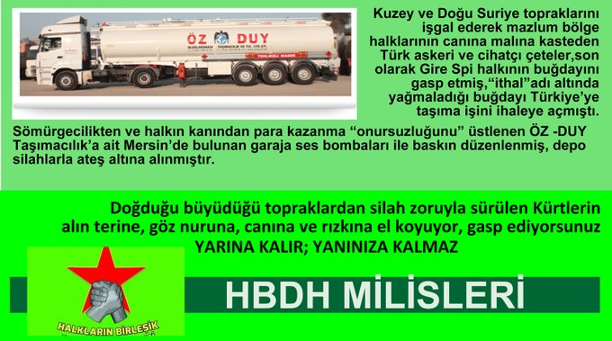 HBDH tarafından yapılan açıklamada Gire Spi’den halktan gasp edilen buğdağı nakliye ihalesini alan ÖZ -DUY şirketine yönelik eylem yapıldığını duyurdu. Eylemde firmaya yönelik yapılan baskında firma deposunun ateş altına alındığı belirtildi. HBDH tarafından yapılan eyleme dair açıklamanın tam metni ise şöyle; Kuzey ve Doğu Suriye topraklarını işgal ederek mazlum bölge [Devamını Oku…]