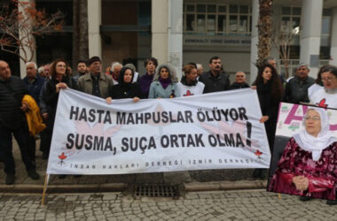 İHD, Menemen R Tipi Hapishanesi’ndeki tutsak Muhlise Karagüzel’in 3 kere kalp krizi geçirmesine rağmen tek kişilik hücrede tutulduğunu açıkladı İnsan Hakları Derneği (İHD) İzmir Şubesi, hasta tutukluların durumuna dikkat çekmek amacıyla 2 haftada bir yaptığı eylem kapsamında Konak eski Sümerbank önünde biraraya geldi. “Hasta mahpuslar ölüyor. Susma, suça ortak olma” [Devamını Oku…]