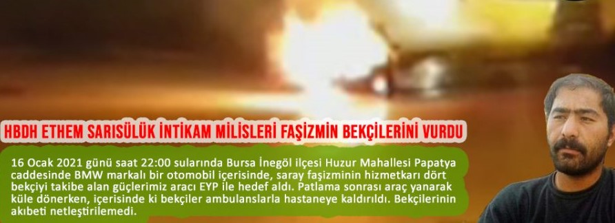 Halkların Birleşik Devrim Hareketi (HBDH) Ethem Sarısülük Milisleri 16 Ocak tarihinde 4 bekçinin içinde bulunduğu araçı EYP ile patlattıklarını duyurdu. HBDH sitesinde yer alan açıklamada bekçilerin akıbetinin netleştirilmediği belirtilirken “Polisin, bekçinin, mahkemelerin açık görevi, sömürü düzenine başkaldıran işçileri coplamak, patronların sömürü çarklarını korumak, özgürlük isteyenleri kuşatmak, hatta kurşunlamaktır.” denildi. Açıklamanın [Devamını Oku…]