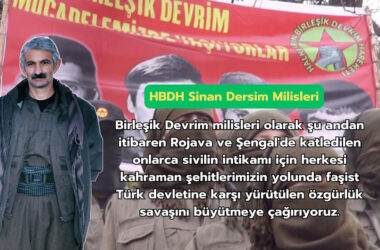 Milisler tarafından yapılan açıklamada ”Kürt Halk Önderi üzerinde tecrit sona erip özgürlüğü sağlanana kadar mücadele kat be kat sürecektir.” denildi HBDH resmi internet sitesinden yapılan açıklamanın tam hali şöyle; Home Eylemler HBDH Sinan Dersim Milisleri; “İstanbul’da Farklı Tarihlerde Misilleme Eylemleri Gerçekleştirdik!” HBDH Milislerinden İmralı Tecridi ve Rojava – Medya Savunma [Devamını Oku…]