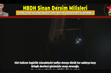 HBDH Sinan Dersim Milisleri: “5 Ağustos günü Amed-Silvan otoyolunda zırhlı araca saldırı gerçekleştirdik” HBDH Sinan Dersim Milisleri, HBDH resmi internet sitesinden yaptığı açıklamada Amed-Silvan otoyolunda zırhlı bir araca eylem düzenlediklerini açıkladı. Yapılan açıklamanın tam metni şöyle; ”Milislerimiz 15 Ağustos Diriliş Hamlesini selamlamak için eylemlerine devam ediyor. 5 Ağustos’ta gece 23 [Devamını Oku…]