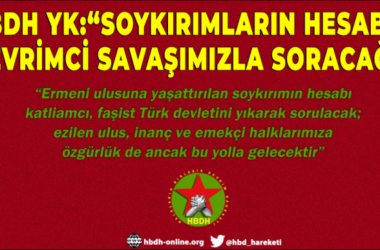 HBDH YK (Halkların Birleşik Devrim Hareketi) Yürütme Komitesi Ermeni soykırımının yıl dönümüne ilişkin yazılı açıklamada bulundu. Açıklamanın tamamı şu şekildedir; Bundan 107 yıl önce, çöküş sürecinin sonuna gelmiş olan Osmanlı Devleti toprakları içinde, büyük bir soykırıma uğrayıp, binlerce yıldır yaşadıkları topraklarda tarifsiz acıları yaşadılar Ermeniler. Dönemin İttihat ve Terakki Cemiyeti’nin, [Devamını Oku…]
