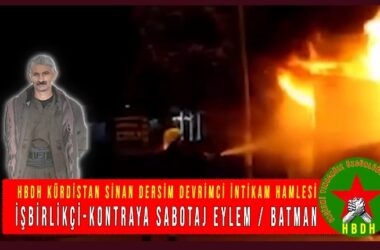 Halkların Birleşik Devrim Hareketi (HBDH) tarafından yapılan yazılı açıklamayla işbirlikçi olduğu ifade edilen Ömer Arburşu’ya ait av malzemelerinin satıldığı mülke yönelik eylem yapıldığını duyurdu. HBDH tarafından yapılan eylem açıklamasından Batman’da gerçekleştirilen eylemde dükkanın tamamen imha edildiği belirtilirken eyleminde HBDH Kürdistan Komitesi olarak başlatıldığı ifade edilen Şehid Sinan Dersim Devrimci İntikam [Devamını Oku…]