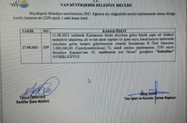 Van’da yaşanan sel felaketinde etkilenen halka yardım ulaştırmayan Van Büyükşehir Belediyesi kayyumunun, belediyenin kaynaklarıyla aynı tarihlerde Kastamonu ve Bartın’da yaşanan sel felaketine ilişkin bu kentlere yardımda bulunduğu ortaya çıktı. Sık sık doğal afetlerler boğuşan Van’da Temmuz ve Ağustos ayı içinde dahi 3 ilçede büyük seller yaşanırken, çok sayıda hayvan öldü, [Devamını Oku…]