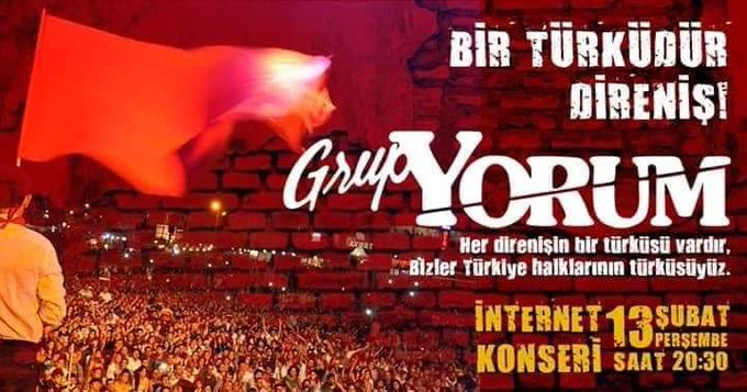 Grup Yorum, açlık grevi ve ölüm orucunda olan üyeleri içinbugün saat 20.30’da internetten destek konseri verecek. “Her direnişin bir türküsü vardır. Bizler Türkiye halklarının türküsüyüz” sloganıyla yapılacak olan konser Grup Yorum’un sosyal medya hesaplarında canlı paylaşılacak.
