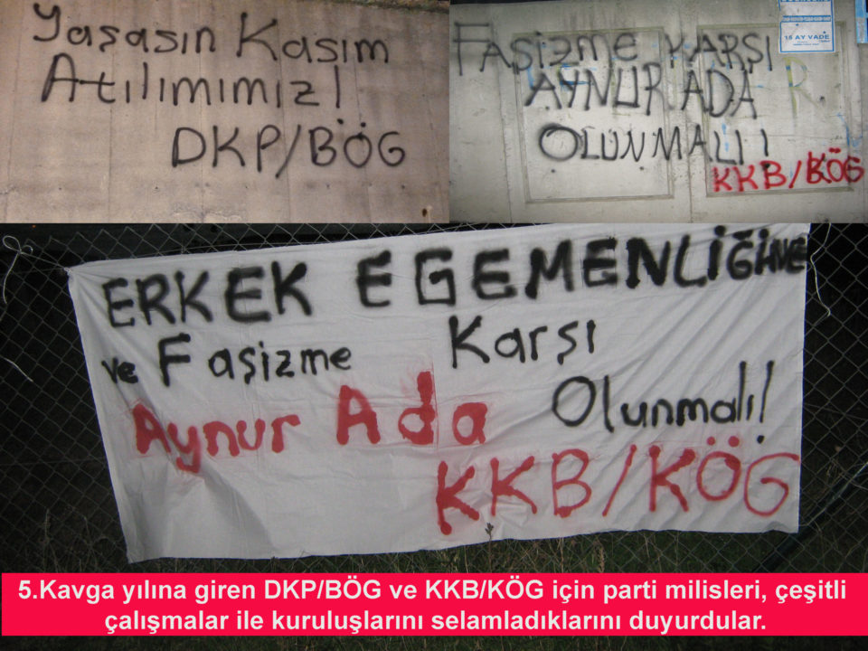 DKP/BÖG ve KKB/KÖG Milisleri Türkiye’nin çeşitli illerinde pankart asma ve yazılama çalışmaları yaparak parti kuruluşlarının 5. yıldönümünü selamladıklarını duyurdular. Açıklamada “Kasım atılımız ile 2014 yılında Türkiye’nin sokaklarından Rojava direnişine katılarak ölümsüzleşen önderlerimizi ve 5. kavga yılına giren partimiz DKP/BÖG’ ün yürüttüğü sosyalizm mücadelesini selamlıyoruz. Onların izinde ve yolunda Türkiye sokaklarını [Devamını Oku…]